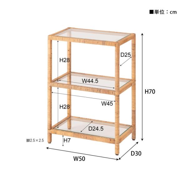 ●透明感が美しい取り外し可能なガラス、スチールフレームに巻いた天然ラタンの相性がぴったりなガラスシェルフ。