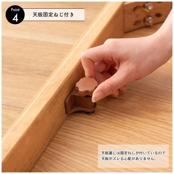 ●天板裏には天板固定ネジが付いているので、こたつ布団を使わない時は天板をしっかり固定。