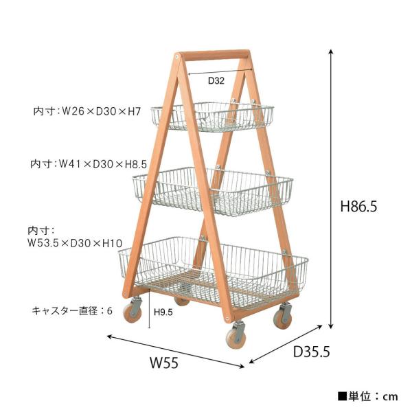 ■しっかり収納/ワイヤーバスケットを3段備えた、収納力のあるバスケットワゴン。上段内寸:幅26×奥行30×高さ7cm、 中段内寸:幅41×奥行30×高さ8.5cm、 下段内寸:幅53.5×奥行30×高さ10cm