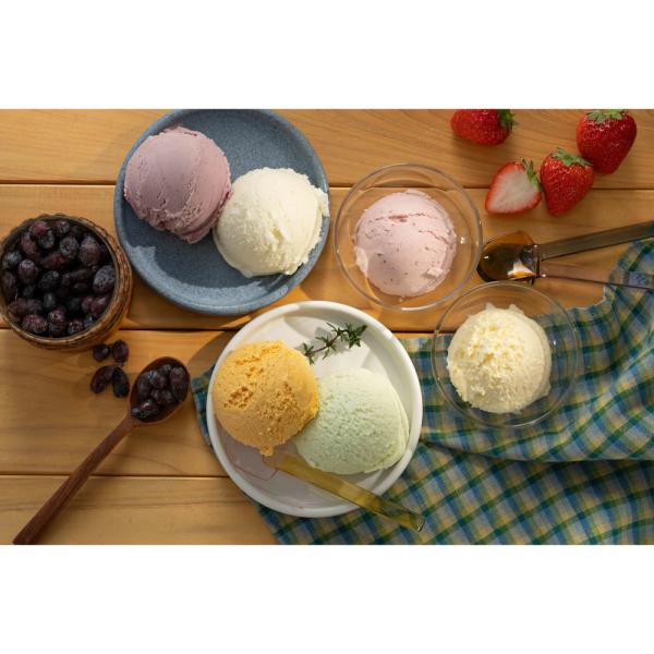 北海道牛乳を使用したアイスセット。人気のバニラに赤肉・青肉メロンやハスカップ、ストロベリーの4種のフルーツの味も楽しめます。【生産地】